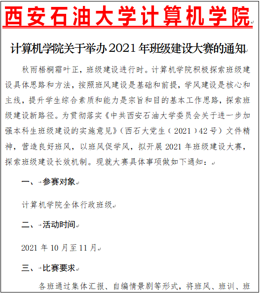 此次大赛拟在全院开展以班级文化和学风建设为重点,以班主任、班干部为核心,以全员参与为主线的班级建设活动。通过班级集体汇报、自编情景剧等,结合学科专业特点,创新实践形式,开展丰富多彩的班级活动,建设富有特色的班级,形成班级建设与学生个性发展相结合的良好氛围,为培养德智体美劳全面发展的社会主义建设者和接班人提供良好的班级氛围。