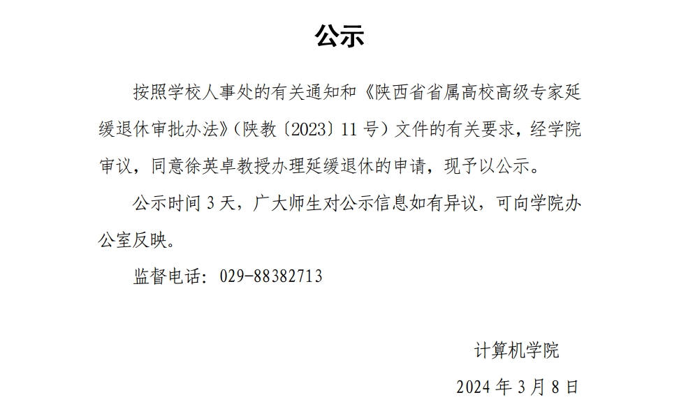 关于徐英卓教授申请延缓退休的公示